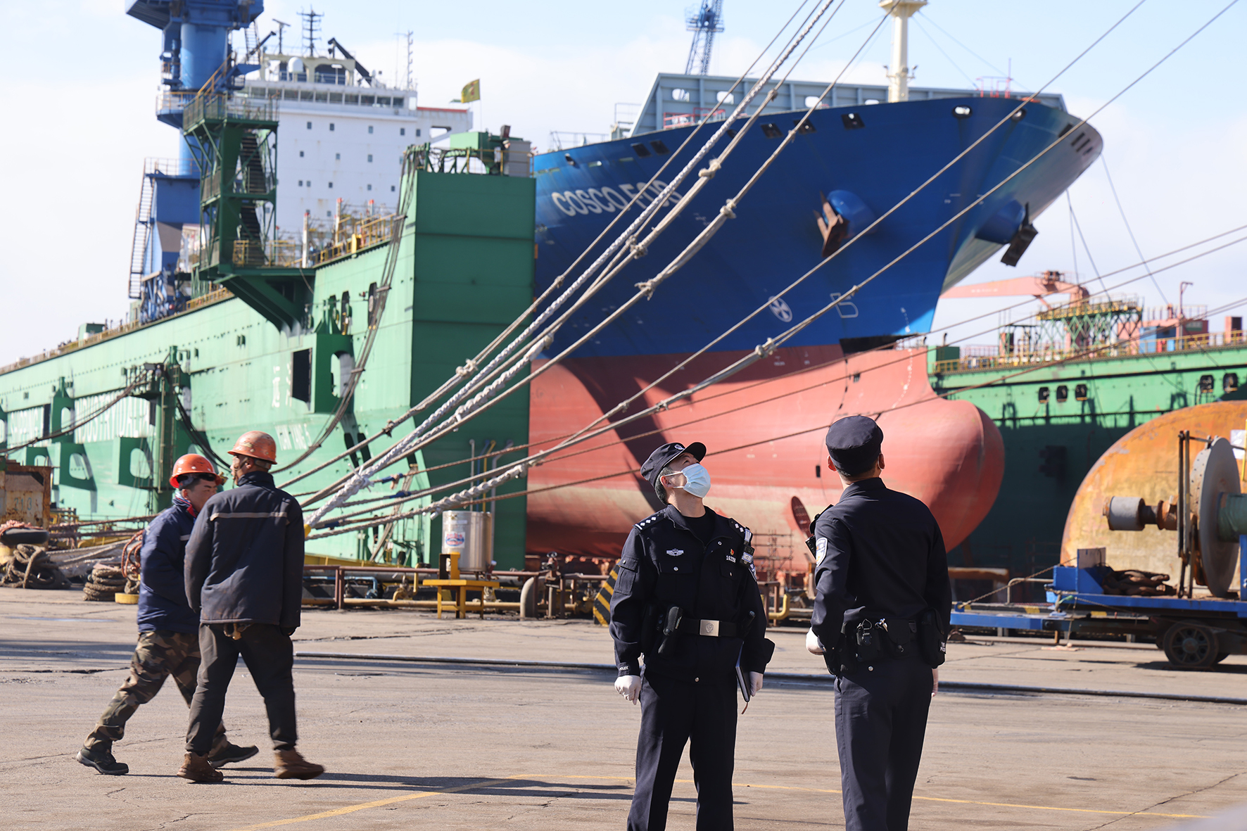 近日,遼寧大連出入境邊防檢查站出臺(tái)服務(wù)海港口岸高質(zhì)量發(fā)展十一項(xiàng)措施提升通關(guān)便利化水平,內(nèi)容包括創(chuàng)新實(shí)現(xiàn)邊檢通關(guān)進(jìn)度“一鍵直推”、開(kāi)通“邊檢即時(shí)通”平臺(tái)、保障特定類(lèi)型船舶“特辦快辦”等。圖為11月14日,民警走訪造船企業(yè)。