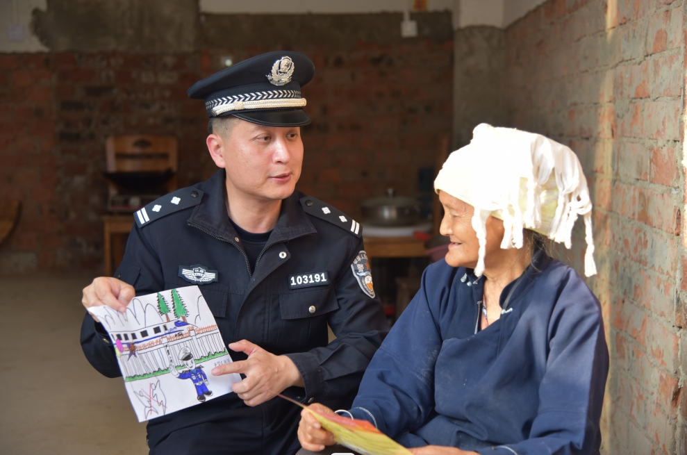 近日,南寧鐵路公安局北海公安處五象南站派出所民警進村入戶,通過一幅幅自繪水彩畫,向村民宣傳鐵路安全與防詐反詐等知識。圖為民警向群眾宣傳鐵路安全知識。 本報通訊員 廖才立 攝