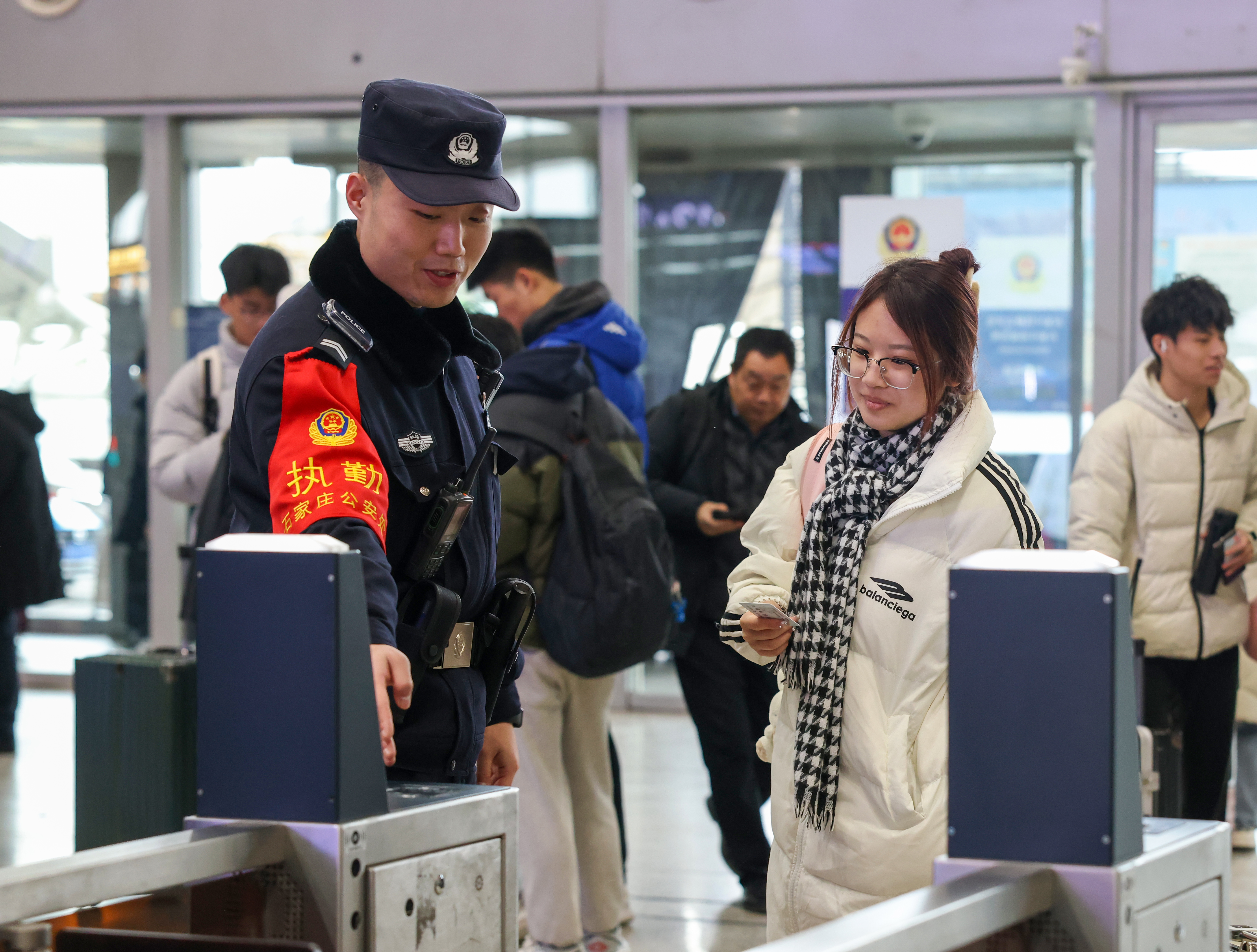 隨著高校寒假開啟,大學(xué)生客流持續(xù)攀升,北京鐵路公安局石家莊公安處石家莊站派出所近日深入開展暖心護航行動,開通綠色通道,全力保障學(xué)生旅客平安出行。圖為民警指引大學(xué)生旅客使用自動閘機進站乘車。