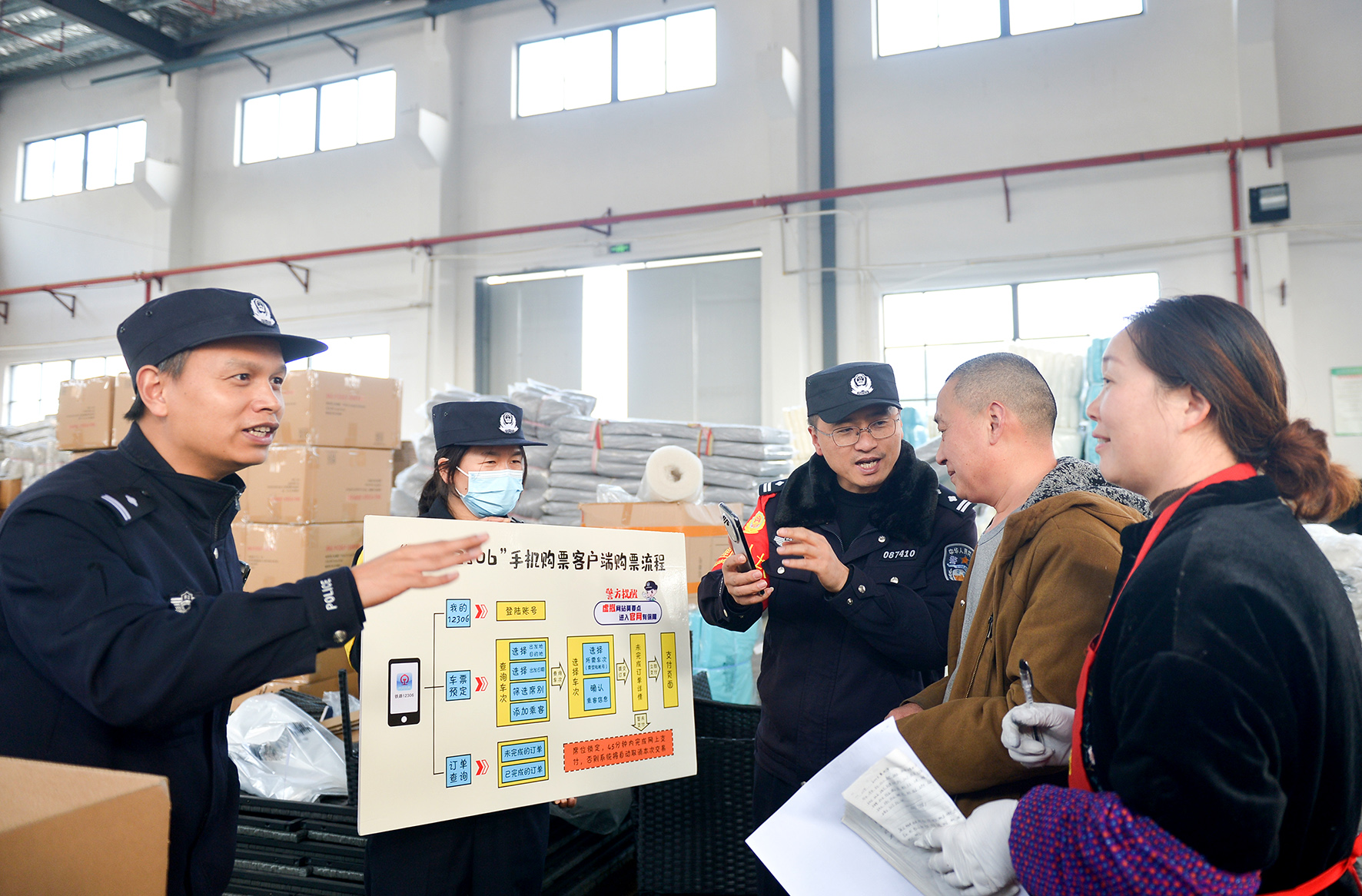 1月15日,杭州鐵路公安處臺州站派出所民警在企業(yè)車間,指引務(wù)工人員在鐵路12306官方平臺購買春運期間車票。