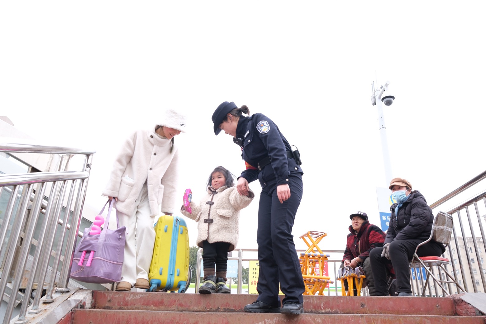 近日,湖北省普降大雪。為確保廣大旅客安全出行,襄陽(yáng)鐵路公安處乘警支隊(duì)與襄陽(yáng)車(chē)站派出所積極做好車(chē)站及列車(chē)秩序維護(hù)工作,保障旅客生命及財(cái)產(chǎn)安全。圖為2月26日,民警幫助一位帶小孩的女士進(jìn)站乘車(chē)。