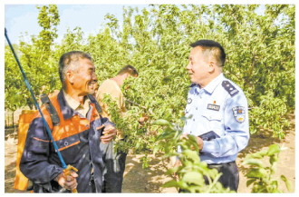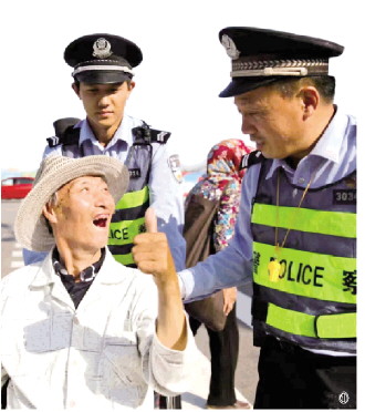 圖① 李華瑞(右)在巡邏途中遇到一名殘疾老人,主動(dòng)為其推輪椅,并囑咐他注意安全。