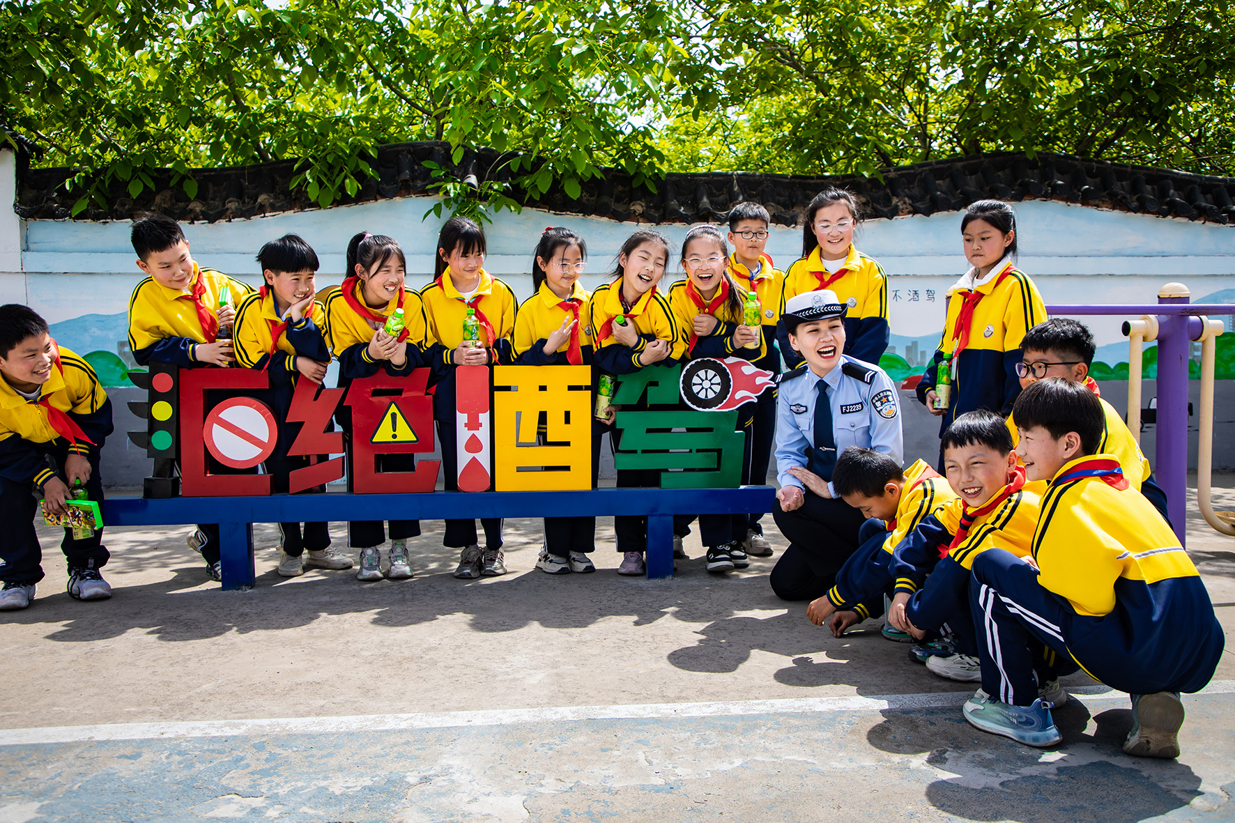 4月17日,山東省滕州市公安局交警大隊組織學(xué)生在卓莊村交通安全主題公園開展“拒絕酒駕”交通安全宣傳活動,民警用通俗易懂的語言講解酒駕的危害性。