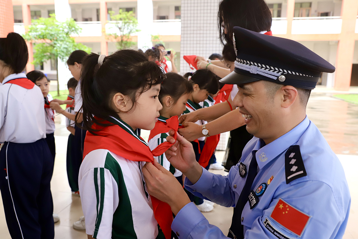 近日,珠海邊檢總站開平邊檢站組織民警來到開平市梁金山小學開展進校園活動,為學生們帶來一堂生動的愛國主義教育課。圖為開平邊檢站移民管理警察為新加入少先隊的學生佩戴紅領巾。