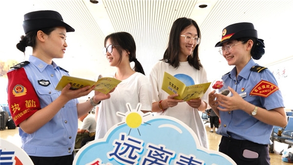 在國(guó)際禁毒日來(lái)臨之際,杭州鐵路公安處聯(lián)合客運(yùn)部門(mén)開(kāi)展形式多樣的禁毒主題宣傳教育活動(dòng)。圖為民警在候車室向旅客發(fā)放禁毒宣傳資料。