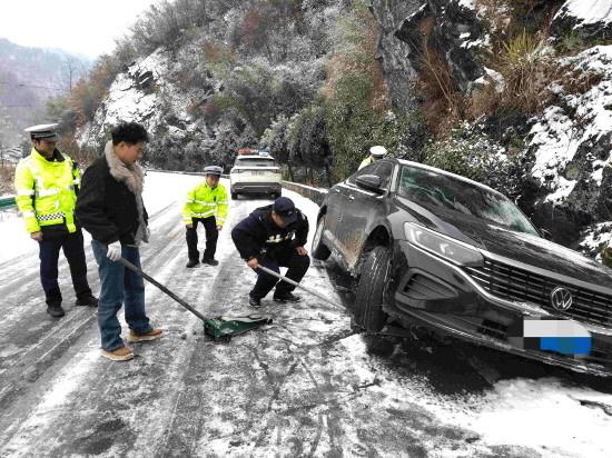 “高速公路各收費(fèi)站口僅允許三型以上貨車通行。晚上道路結(jié)冰,你現(xiàn)在上高速不安全?!睏顣运烧?qǐng)司機(jī)靠邊停車,待除雪車裝滿鹽后,護(hù)送對(duì)方到鄖西。