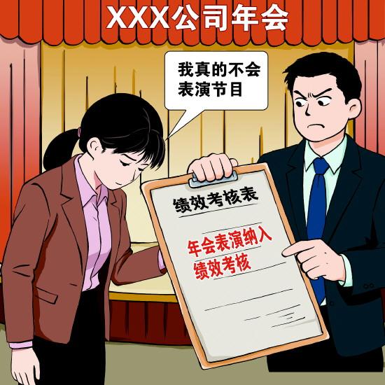 廣東深圳某公司員工因拒絕在年會上表演節(jié)目,被公司以“不服從安排”為由解雇;社交平臺上,有“打工人”發(fā)帖吐槽,公司年會將表演節(jié)目與績效掛鉤,讓本該輕松的聚會變成“考核現(xiàn)場”……