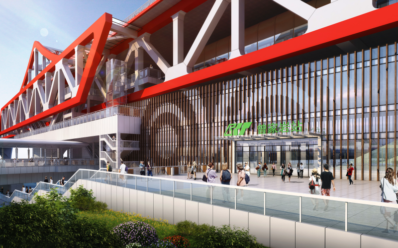 為使車站與大橋形成有機(jī)共生體,曾家?guī)r站外立面桁架采用大橋主體結(jié)構(gòu)的造型元素,換乘平臺采用鋼結(jié)構(gòu)+玻璃欄桿、改建站房采用深色材料形成陰影效果。此外,車站換乘平臺采用玻璃欄桿,外形獨特,形似空中大廳,視野極佳。