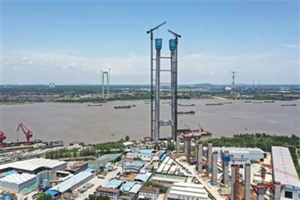 正在建設(shè)中的龍?zhí)堕L(zhǎng)江大橋位于南京長(zhǎng)江四橋與潤(rùn)揚(yáng)長(zhǎng)江大橋之間,北接揚(yáng)州儀征市,南接南京市、鎮(zhèn)江句容市,雙向六車(chē)道,設(shè)計(jì)時(shí)速100公里,全長(zhǎng)4925米。新華社記者 楊磊 攝
