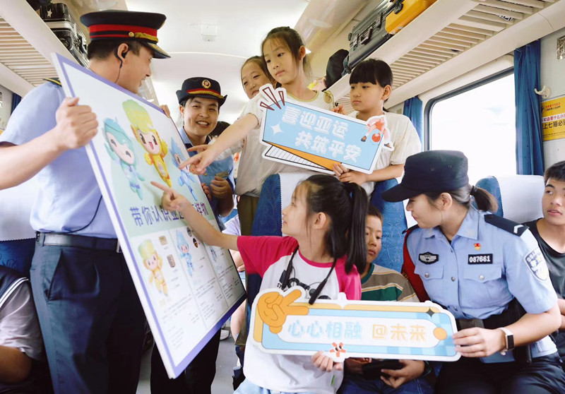 近日,杭州鐵路公安處乘警支隊乘務(wù)一大隊聯(lián)合杭州客運段甬西車隊開展“迎亞運、護平安”宣傳活動。