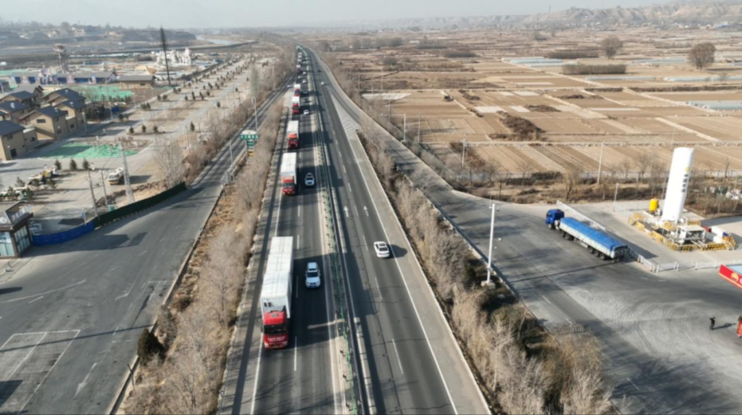 運送救災物資的貨車車隊在臨夏服務區(qū)休整