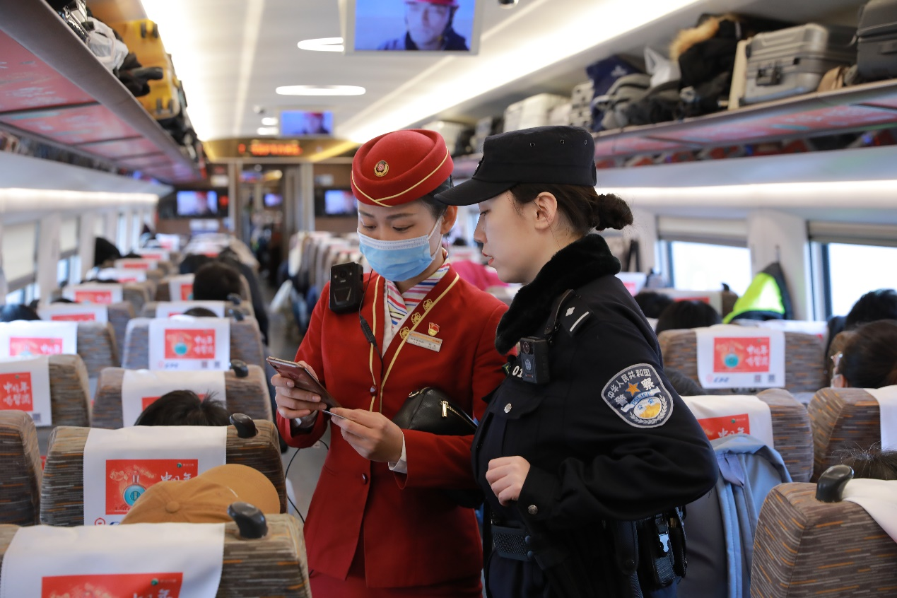 今年,北京鐵路公安處乘警支隊女子乘警隊首次參加春運值乘任務,主要值乘管內京滬線上的部分高鐵列車。她們堅守工作崗位落實各項安保任務,并向旅客發(fā)放反詐宣傳冊、宣講反詐常識等。圖為G9高鐵上,乘警紀明月與當次列車長一起進行車內巡檢。 本報記者 常鑫 本報見習記者 韓毅 邢國涵 攝