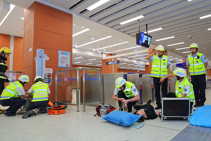 演練現場,模擬末端列車駕駛員室因電氣設備短路引發(fā)火情,使得列車迫停于區(qū)間,大量乘客受困于車廂內,同時因無法動車影響其他列車運行,導致學苑北路站客流積壓的事件場景。演練過程組織嚴密、緊張有序,火災警報觸發(fā)后,地鐵運營工作人員快速到達受困車廂安撫“乘客”并就近實施疏散,在引導“乘客”逃生的同時時刻關注“乘客”身體狀況,及時開展救助救援和急救措施。車站內軌道運營企業(yè)先期處置、區(qū)級應急力量參與、市指揮部指揮跨區(qū)應急聯(lián)動,車站外市消防救援總隊、市衛(wèi)健委等市指揮部成員單位和區(qū)指揮部成員單位之間協(xié)同配合聯(lián)動處置,各級預案逐步啟動,各單位、部門及時響應,對預設場景應急處置快速得當。