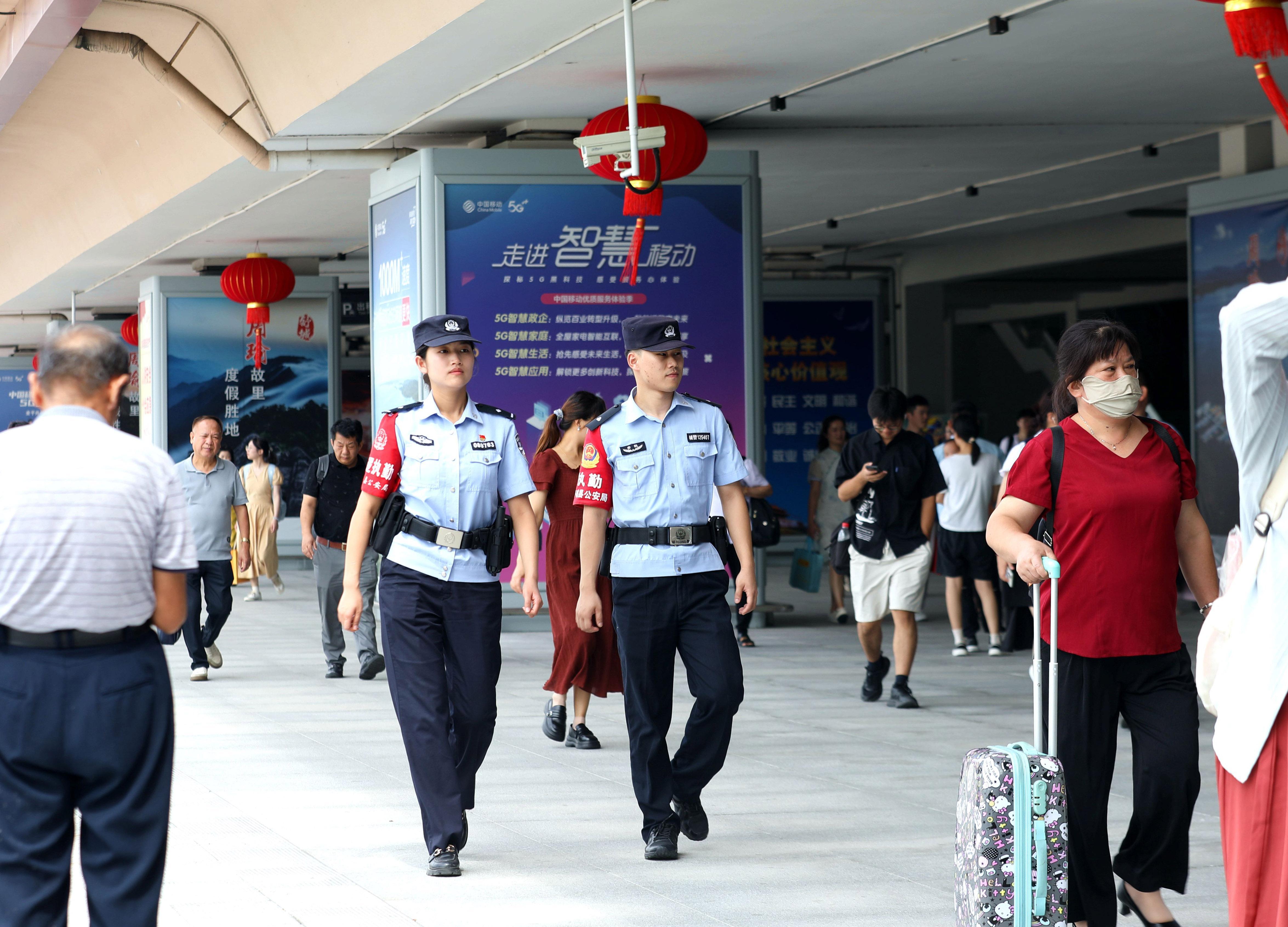 中秋假期,安徽省舒城縣公安局高鐵東站警務站組織全體民警輔警加大巡邏檢查力度和服務,確保旅客出行安全。