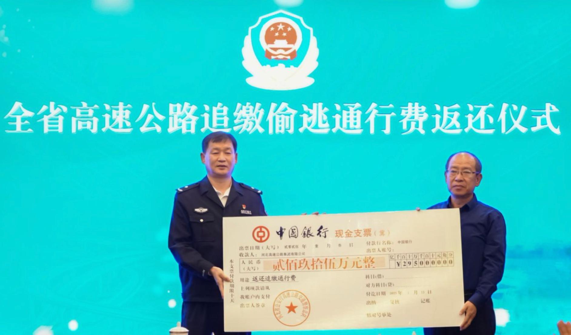 為集中展示高速交警依法刑事打擊涉交類違法犯罪專項(xiàng)行動(dòng)成效,1月3日,河北省高速交警總隊(duì)舉辦全省高速公路追繳偷逃通行費(fèi)返還儀式,向河北高速集團(tuán)、河北交投集團(tuán)、北京首發(fā)集團(tuán)、內(nèi)蒙古交通集團(tuán)、石家莊市高速集團(tuán)5家業(yè)主單位返還追繳偷逃通行費(fèi)550萬元。