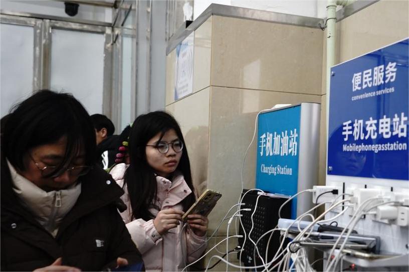 1月19日,在黑龍江省漠河市,游客在鐵路漠河站候車室內免費充電。戴錦镕/攝