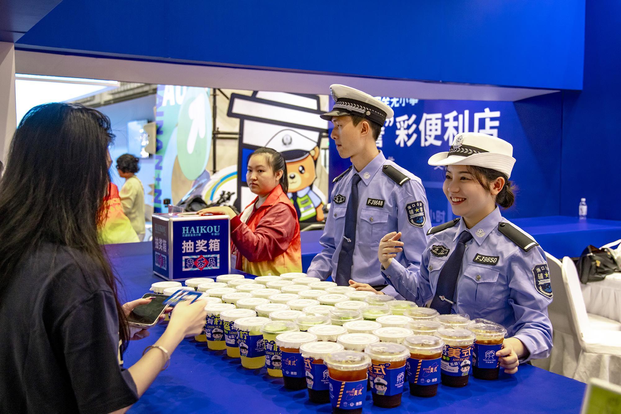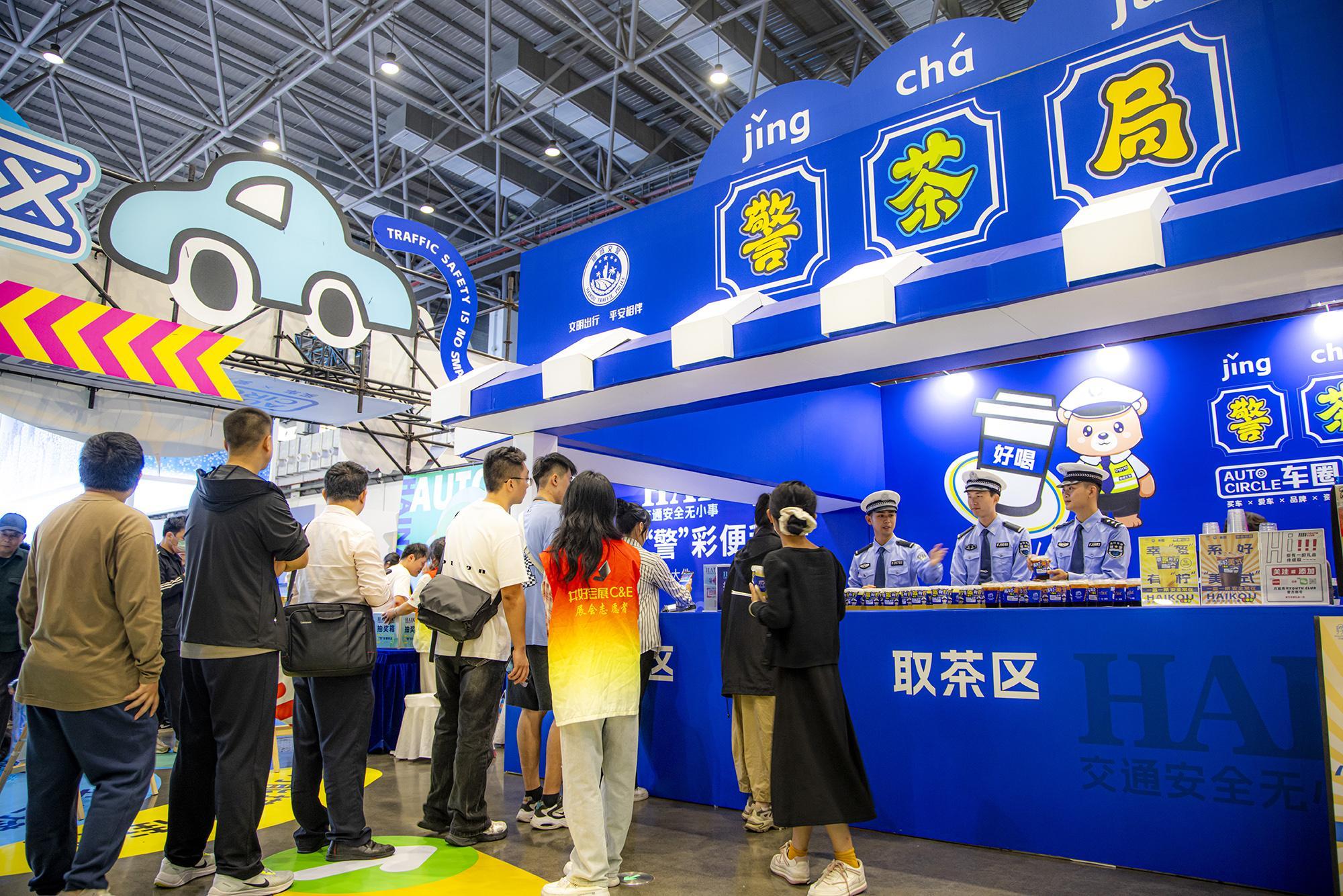 走進(jìn)1號(hào)展館,“警茶局”創(chuàng)意攤位前排起長(zhǎng)龍。市民掃描二維碼參與“交通安全快測(cè)”答題,答對(duì)6題即可兌換限量特調(diào)飲品——清新檸檬茶“幸盔有檸”杯身印有醒目戴頭盔安全提示,咖啡特調(diào)“系好美式”以安全帶印制“系好安全帶,平安出發(fā)”標(biāo)語(yǔ),巧妙融合普法知識(shí)點(diǎn)。交警化身“茶飲師”為市民送上安全特調(diào)飲品,貼心叮囑出行安全事項(xiàng),警民互動(dòng)其樂(lè)融融。