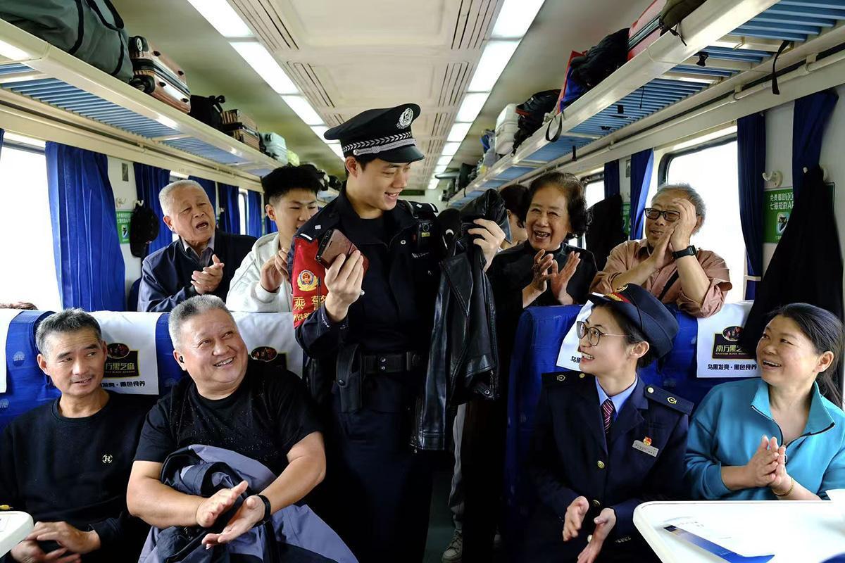 10月28日,上海鐵路公安局杭州公安處乘警支隊(duì)聯(lián)合杭州客運(yùn)段杭蘭車隊(duì)在T112列車上向老年旅客講解乘車安全知識。