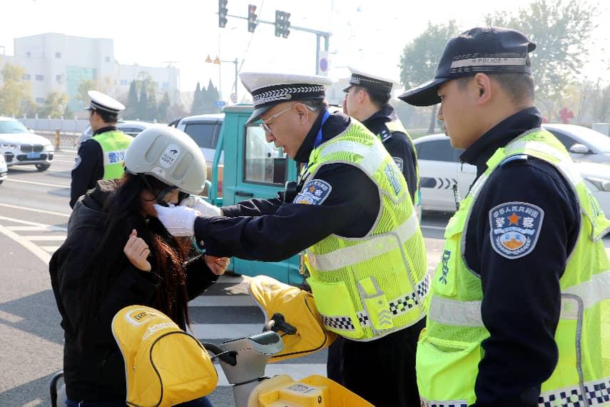 圖為東營交警在路口引導(dǎo)電動(dòng)車駕乘人員正確佩戴頭盔。