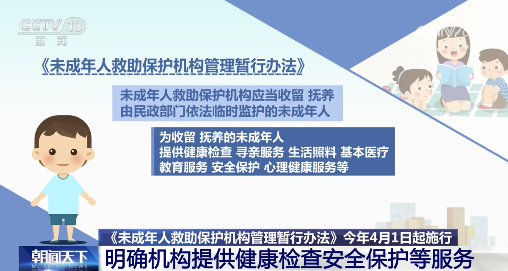 《未成年人救助保護(hù)機構(gòu)管理暫行辦法》今年4月1日起施行 明確機構(gòu)提供健康檢查安全保護(hù)等服務(wù)