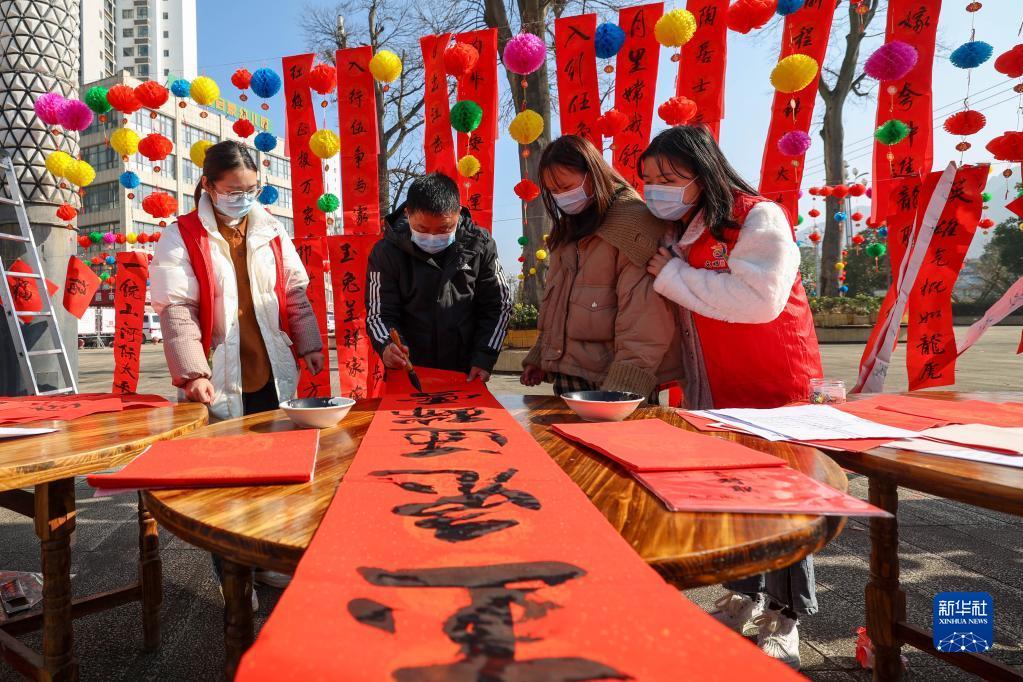 1月12日,貴州省畢節(jié)市七星關(guān)區(qū)青龍街道辦事處書法愛(ài)好者為居民書寫春聯(lián)。新華社發(fā)(韓賢普攝)
