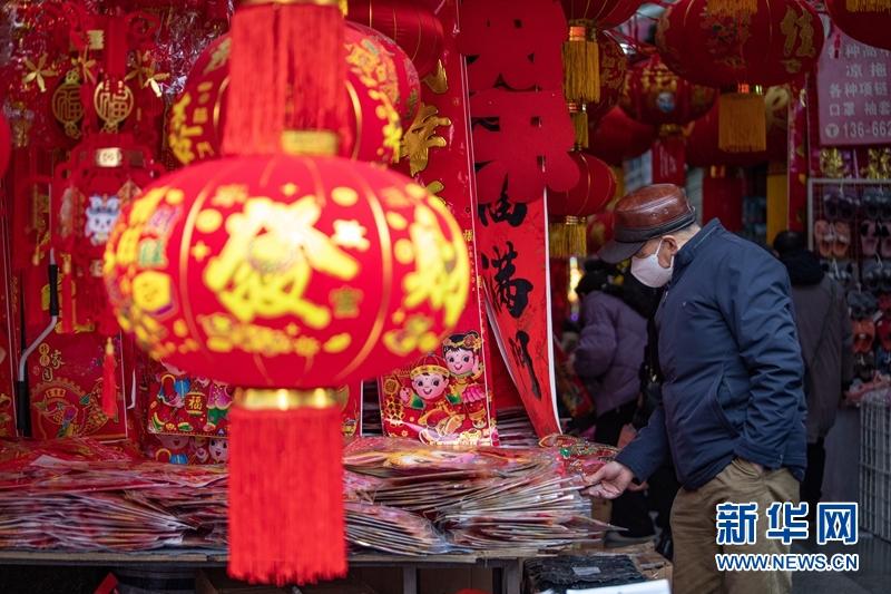 市民在商鋪采購春聯(lián)、“福”字等傳統(tǒng)年貨。