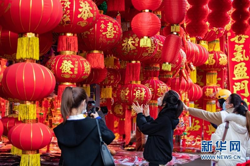 市民在成都荷花池批發(fā)市場商鋪采購春聯(lián)、“?!弊值葌鹘y(tǒng)年貨。