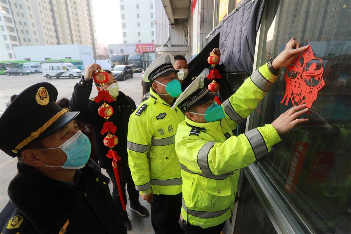 日前,陜西省渭南市澄城縣交警大隊(duì)聯(lián)合交通運(yùn)輸部門(mén)走進(jìn)轄區(qū)客運(yùn)公司,開(kāi)展春運(yùn)道路交通安全檢查與宣傳活動(dòng)。對(duì)駕駛員的駕駛資質(zhì)、隨車(chē)安全設(shè)施設(shè)備進(jìn)行了檢查,在承運(yùn)的車(chē)輛上全部粘貼“安全帶、禁止撥打手機(jī)”等交通安全提示貼。與往年不同的是,今年民警給運(yùn)輸企業(yè)候車(chē)大廳張貼了“ 溫暖回家路”的主題宣傳剪紙,通過(guò)群眾喜聞樂(lè)見(jiàn)的形式宣傳平安回家注意事項(xiàng)。
