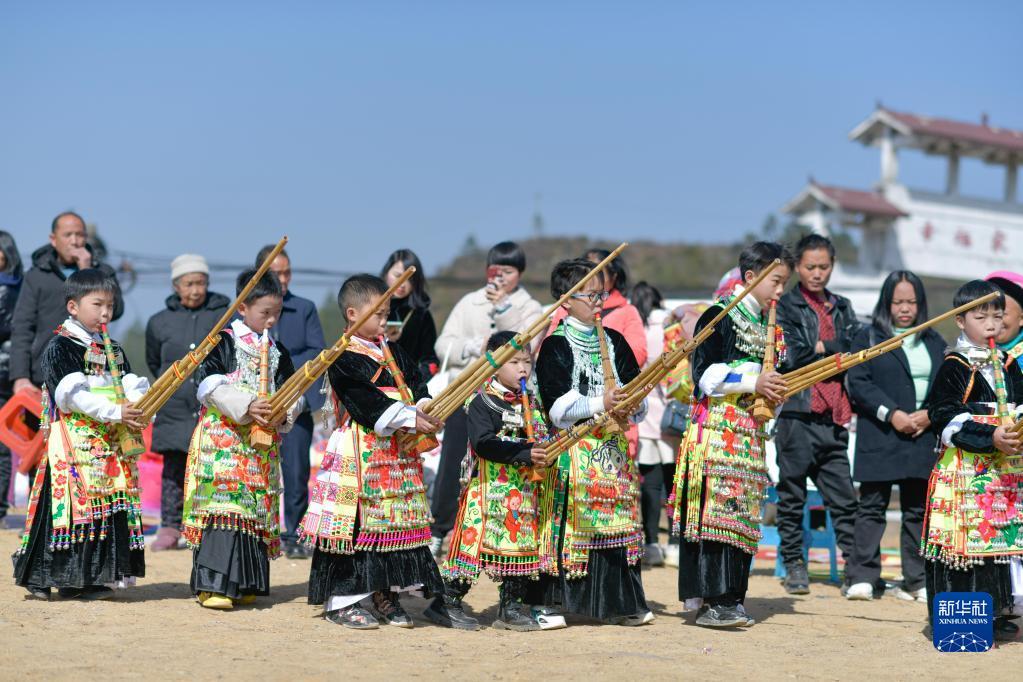 1月29日,苗族孩子在中排村參加“跳月”活動。
