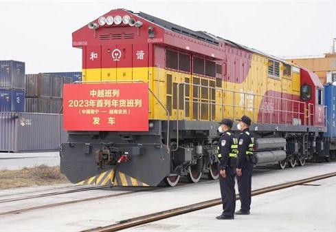 1月19日,一列滿載特色食品以及日用品等貨物的中越班列從南寧國際鐵路港駛出,為東盟國家同慶春節(jié)送去滿滿年貨……