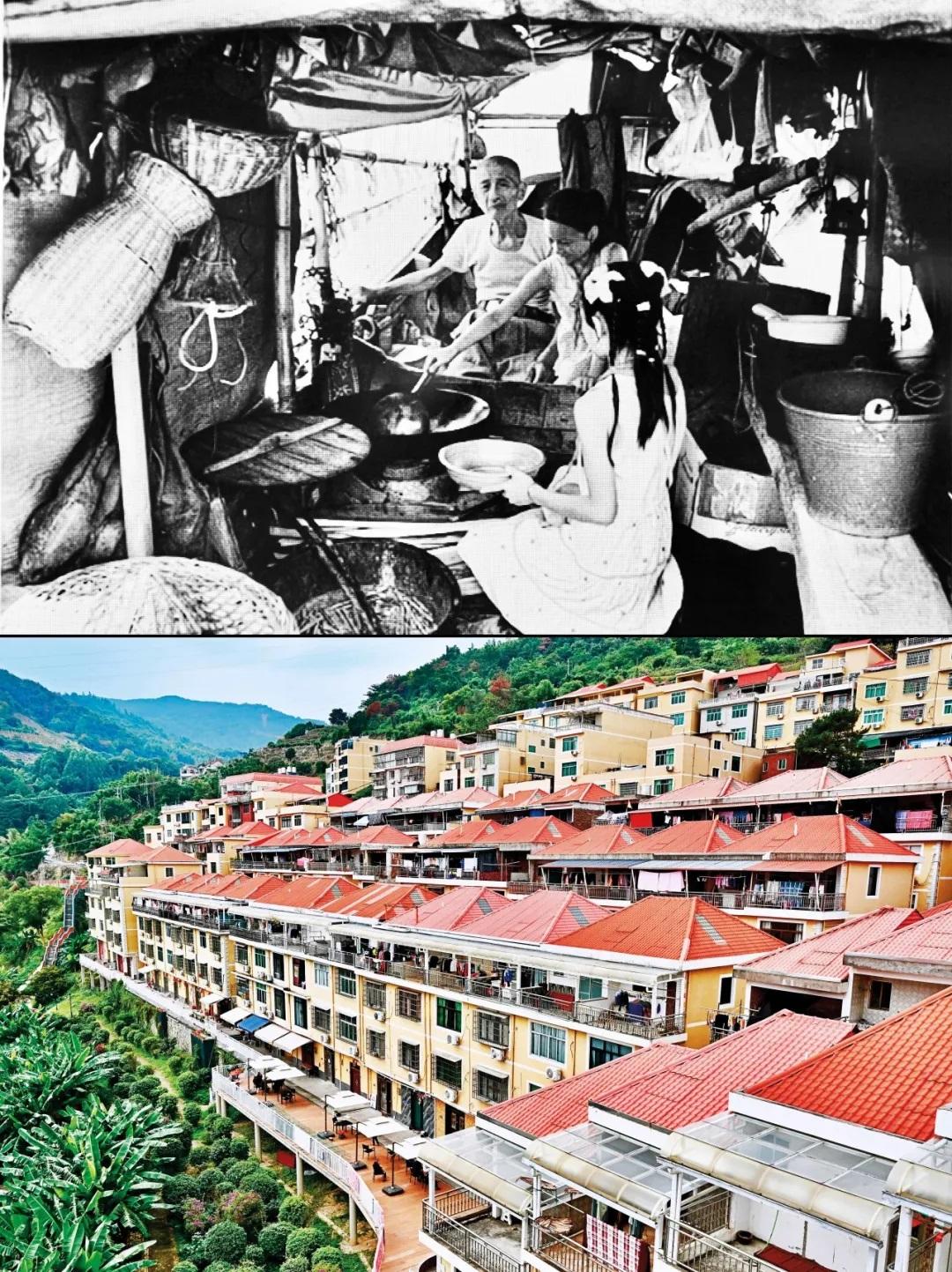 在福建省寧德市福安市下岐村,歷史上,村民祖祖輩輩以在淺海灘涂“討小海”為生,一條小木船就是幾代人的家,生活條件異常艱苦,被稱為“連家船民”。20世紀(jì)90年代,福建“造福工程”啟動,下岐村采取“分期分批,全面搬遷”的辦法,將2000多名漁民安置上岸。如今的下岐村,成排的小洋樓矗立,漁民廣場、白馬公園等休閑設(shè)施一應(yīng)俱全,呈現(xiàn)出一幅百姓安居樂業(yè)的現(xiàn)代鄉(xiāng)村圖景。圖為拼版照片:上圖為20世紀(jì)80年代福建寧德地區(qū)的連家船民生活場景(資料照片);下圖為2023年11月15日拍攝的下岐村(新華社記者 姜克紅/攝)。 新華社發(fā)