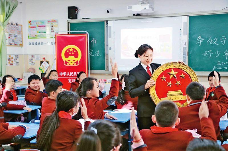 2024年12月4日是我國(guó)第十一個(gè)國(guó)家憲法日,12月1日至7日,各地開(kāi)展以“大力弘揚(yáng)憲法精神,推動(dòng)進(jìn)一步全面深化改革”為主題的“憲法宣傳周”活動(dòng)。圖為12月2日,安徽省合肥市廬陽(yáng)區(qū)司法局聯(lián)合人民法院在廬陽(yáng)實(shí)驗(yàn)小學(xué)開(kāi)展“憲法宣講進(jìn)校園”活動(dòng)。司法部供圖