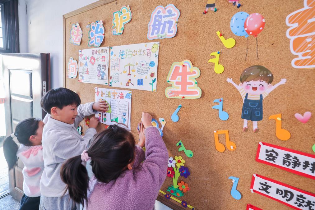 2025年12月9日,浙江省諸暨市暨南街道中心學校王家井小學的學生把自己創(chuàng)作的法治宣傳畫貼到教室的宣傳欄中。新華社記者 徐昱 攝