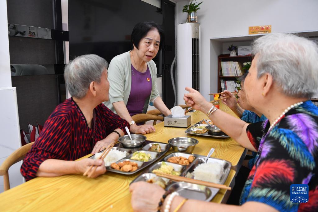 在福建省福州市軍門社區(qū)長者食堂內(nèi),林丹(左二)與用餐的老人交流(2022年9月9日攝)。新華社記者 姜克紅 攝