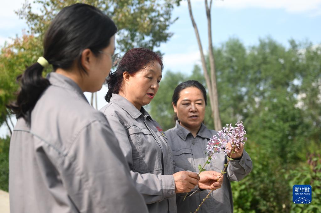 在青海省西寧市林業(yè)科學研究所的培育基地內,張錦梅(中)與同事在比較兩株丁香花束的異同(9月14日攝)。新華社記者 張龍 攝
