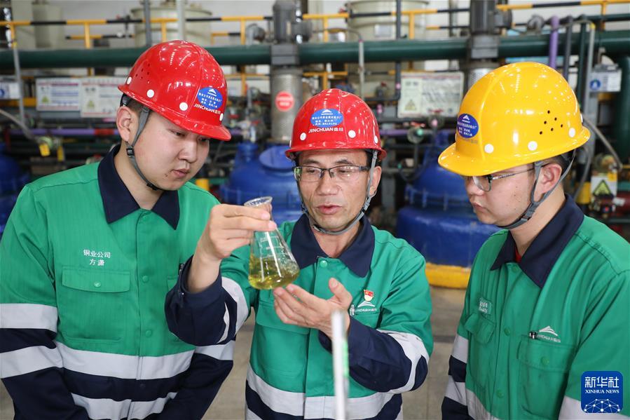 在甘肅省金昌市金川區(qū),金川集團銅業(yè)有限公司貴金屬冶煉分廠提純工序工序長潘從明(中)在生產(chǎn)現(xiàn)場指導(dǎo)職工進行實驗(2022年9月21日攝)。新華社記者 馬希平 攝