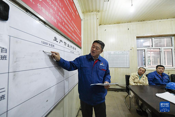 劉伯鳴在廠房會議室內(nèi)為工友講解生產(chǎn)任務(wù)(2022年9月17日攝)。新華社記者 王松 攝