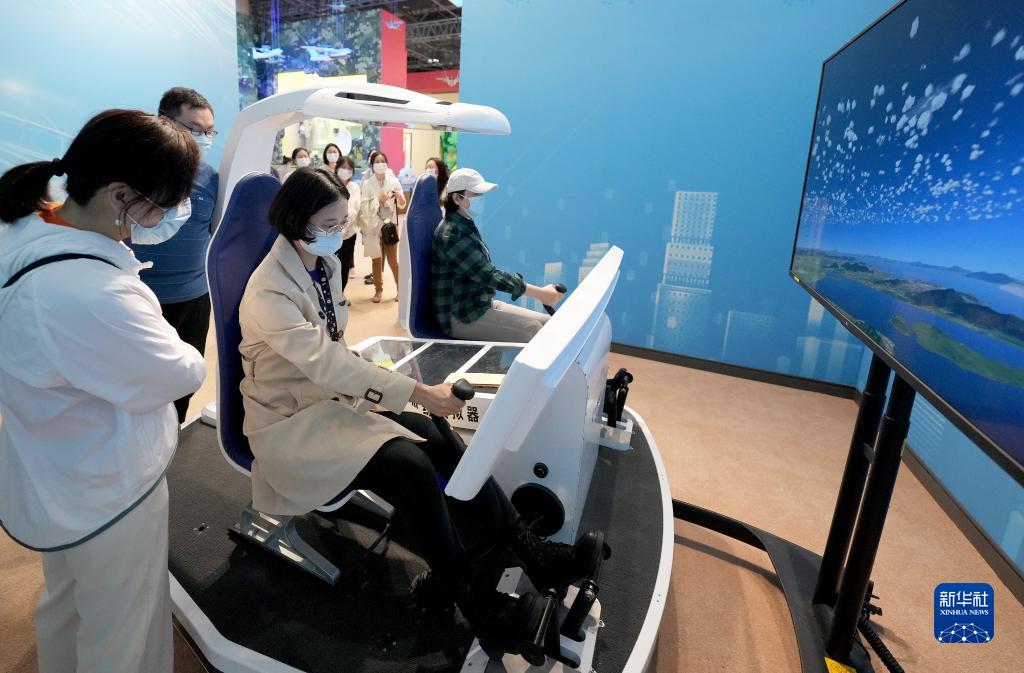 10月7日,觀眾在“奮進(jìn)新時代”主題成就展上體驗操縱直升機(jī)訓(xùn)練模擬器。