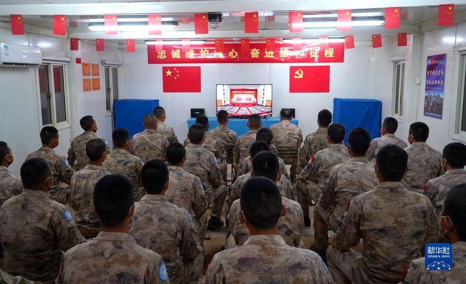 10月16日,中國第十二批赴南蘇丹(瓦烏)維和工兵分隊官兵收看中國共產(chǎn)黨第二十次全國代表大會開幕會。新華社(張益瑋 攝)