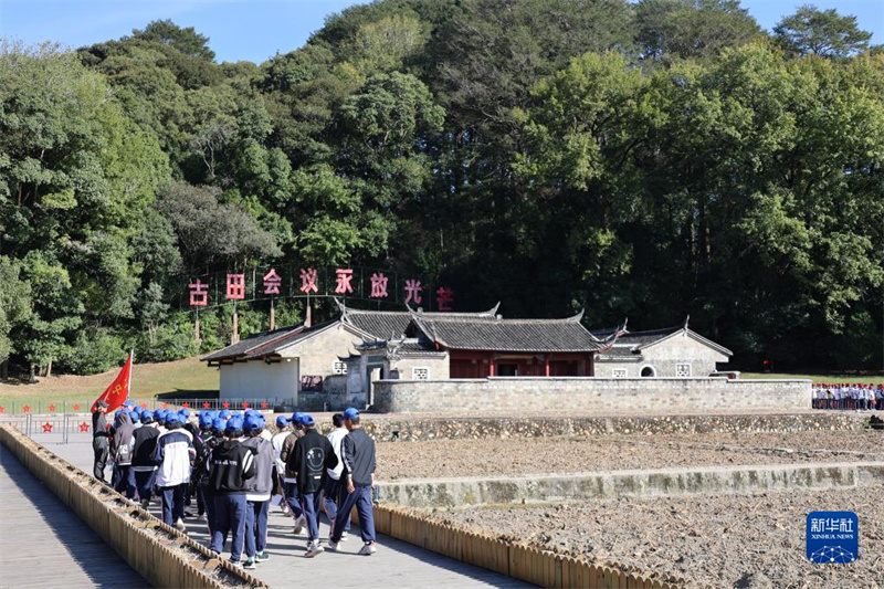 10月19日,在福建省上杭縣古田鎮(zhèn),中學(xué)生研學(xué)團隊在古田會議會址參觀學(xué)習(xí)。新華社發(fā)(范道鑫 攝)