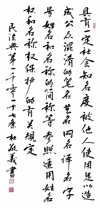 民法典第一千零一十七條 具有一定社會知名度,被他人使用足以造成公眾混淆的筆名、藝名、網(wǎng)名、譯名、字號、姓名和名稱的簡稱等,參照適用姓名權(quán)和名稱權(quán)保護的有關(guān)規(guī)定。