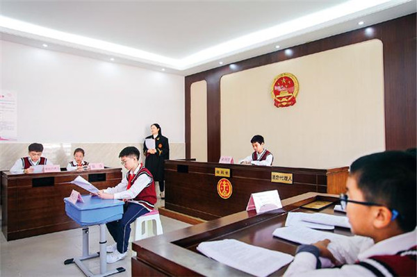 2020年10月30日,安徽省合肥市濱湖世紀社區(qū)在合肥師范附小三小開展“模擬法庭進校園”活動。圖為當日拍攝的模擬法庭“庭審”現(xiàn)場。新華社記者 曹力/攝