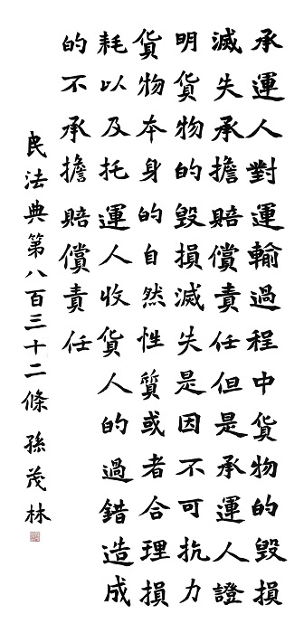 民法典第八百三十二條 承運人對運輸過程中貨物的毀損、滅失承擔(dān)賠償責(zé)任。但是,承運人證明貨物的毀損、滅失是因不可抗力、貨物本身的自然性質(zhì)或者合理損耗以及托運人、收貨人的過錯造成的,不承擔(dān)賠償責(zé)任。