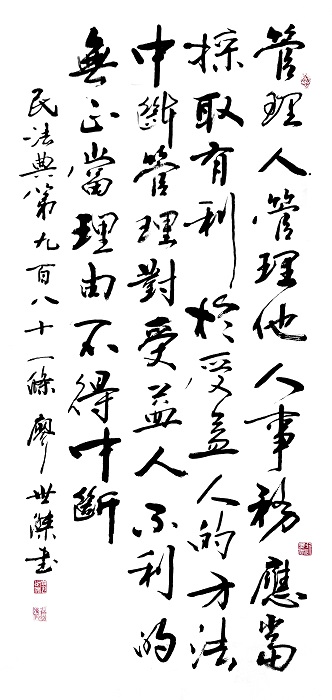 民法典第九百八十一條 管理人管理他人事務(wù),應(yīng)當(dāng)采取有利于受益人的方法。中斷管理對受益人不利的,無正當(dāng)理由不得中斷。