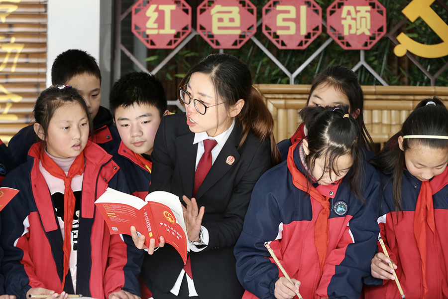 村巷法官徐銀銀走進(jìn)浙江省德清縣莫干山中心學(xué)校,書寫民法典,放飛法治夢(mèng)。