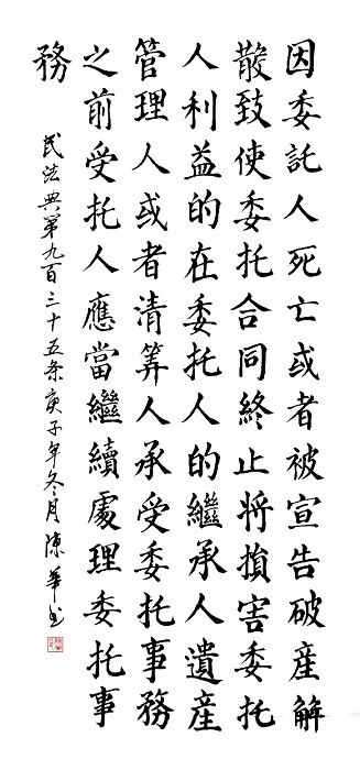 民法典第九百三十五條 因委托人死亡或者被宣告破產、解散,致使委托合同終止將損害委托人利益的,在委托人的繼承人、遺產管理人或者清算人承受委托事務之前,受托人應當繼續(xù)處理委托事務。