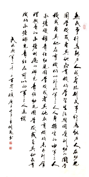 民法典第一千二百零一條 無(wú)民事行為能力人或者限制民事行為能力人在幼兒園、學(xué)?;蛘咂渌逃龣C(jī)構(gòu)學(xué)習(xí)、生活期間,受到幼兒園、學(xué)?;蛘咂渌逃龣C(jī)構(gòu)以外的第三人人身?yè)p害的,由第三人承擔(dān)侵權(quán)責(zé)任;幼兒園、學(xué)?;蛘咂渌逃龣C(jī)構(gòu)未盡到管理職責(zé)的,承擔(dān)相應(yīng)的補(bǔ)充責(zé)任。幼兒園、學(xué)?;蛘咂渌逃龣C(jī)構(gòu)承擔(dān)補(bǔ)充責(zé)任后,可以向第三人追償。
