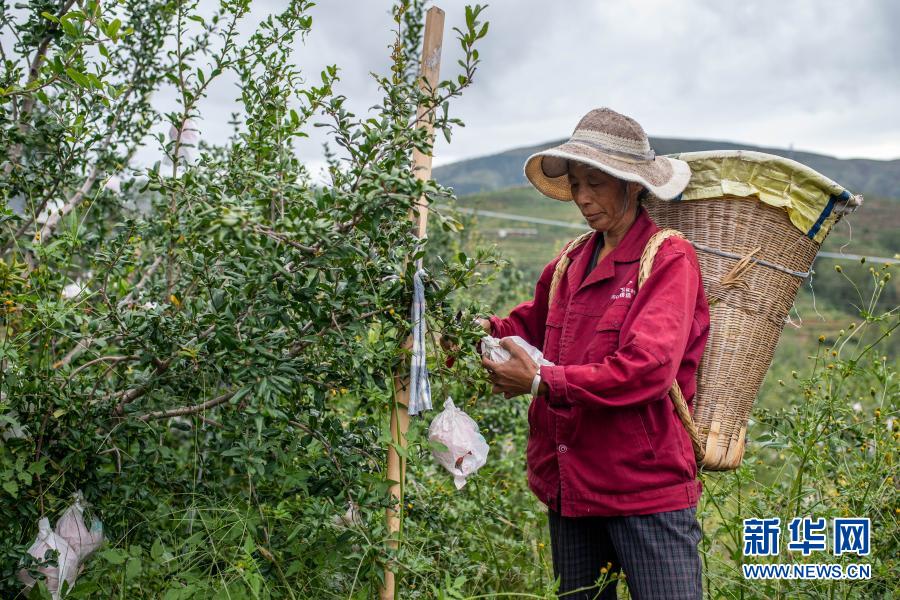 在云南省會(huì)澤縣娜姑鎮(zhèn)干海子村,干海子種植專(zhuān)業(yè)合作社的負(fù)責(zé)人莊錘兵正在地里管護(hù)石榴樹(shù)。