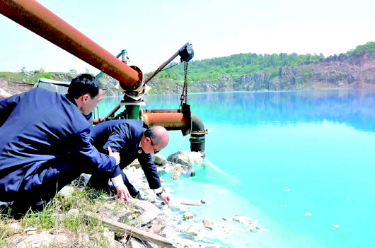 圖為蕪湖市弋江區(qū)檢察院檢察官現(xiàn)場(chǎng)勘測(cè)污染水體。通訊員 朱玉勝 攝
