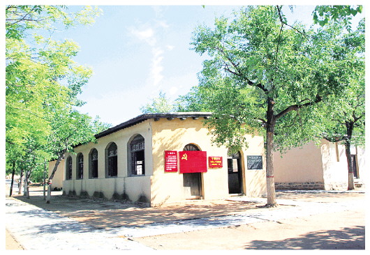 走進(jìn)會(huì)場(chǎng),只見正面掛著一塊絳紫色的幕布,幕布上懸掛兩面繡有“中國(guó)共產(chǎn)黨”字樣的黨旗,黨旗上方是毛澤東和朱德的兩幅畫像,會(huì)場(chǎng)兩側(cè)的白墻上懸掛著四面黨旗。
